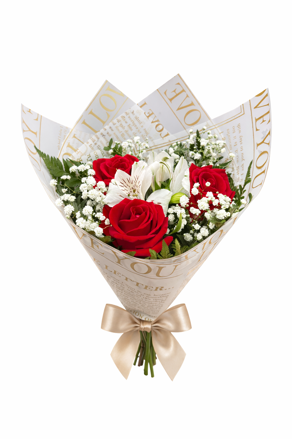 Buquê elegante composto por rosas vermelhas, Astromelias e delicadas mosquitinhos, criando uma combinação clássica e cheia de significado. A montagem recebe acabamento em papel decorativo sofisticado e laço em cetim, garantindo um visual romântico e encantador.