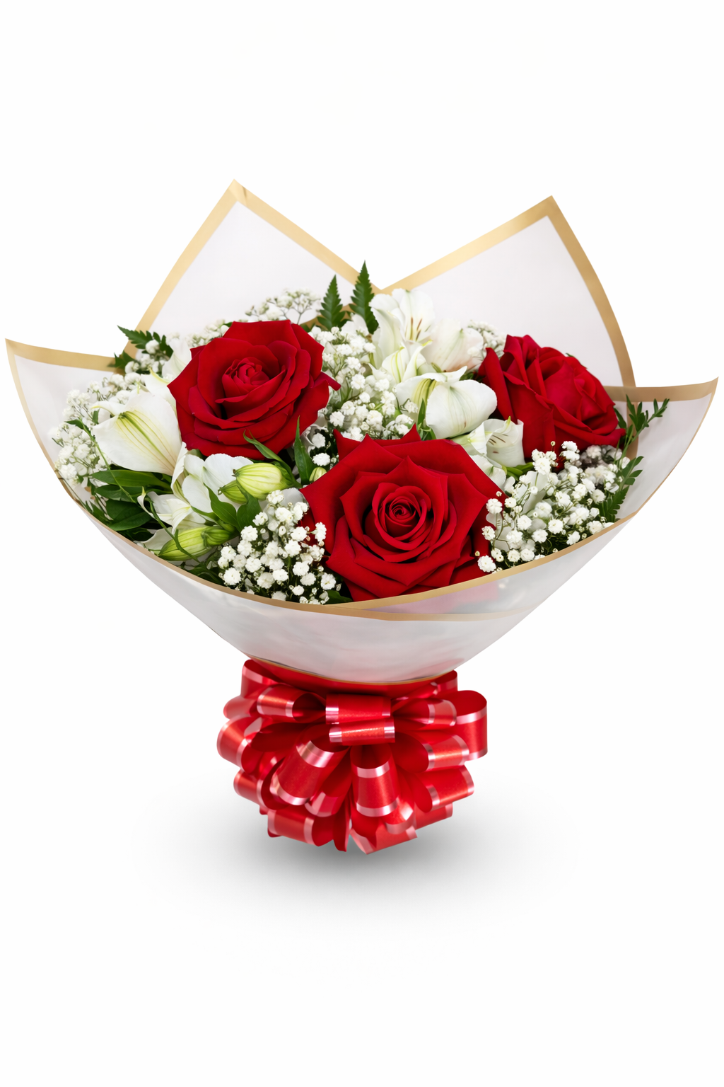 Um buquê sofisticado e atemporal, composto por rosas vermelhas, astromélias brancas e delicadas flores de mosquitinho, envolvido em embalagem refinada com acabamento dourado e laço vermelho. Ideal para expressar amor, romantismo e admiração, perfeito para datas especiais como aniversários, pedidos românticos ou declarações inesquecíveis.